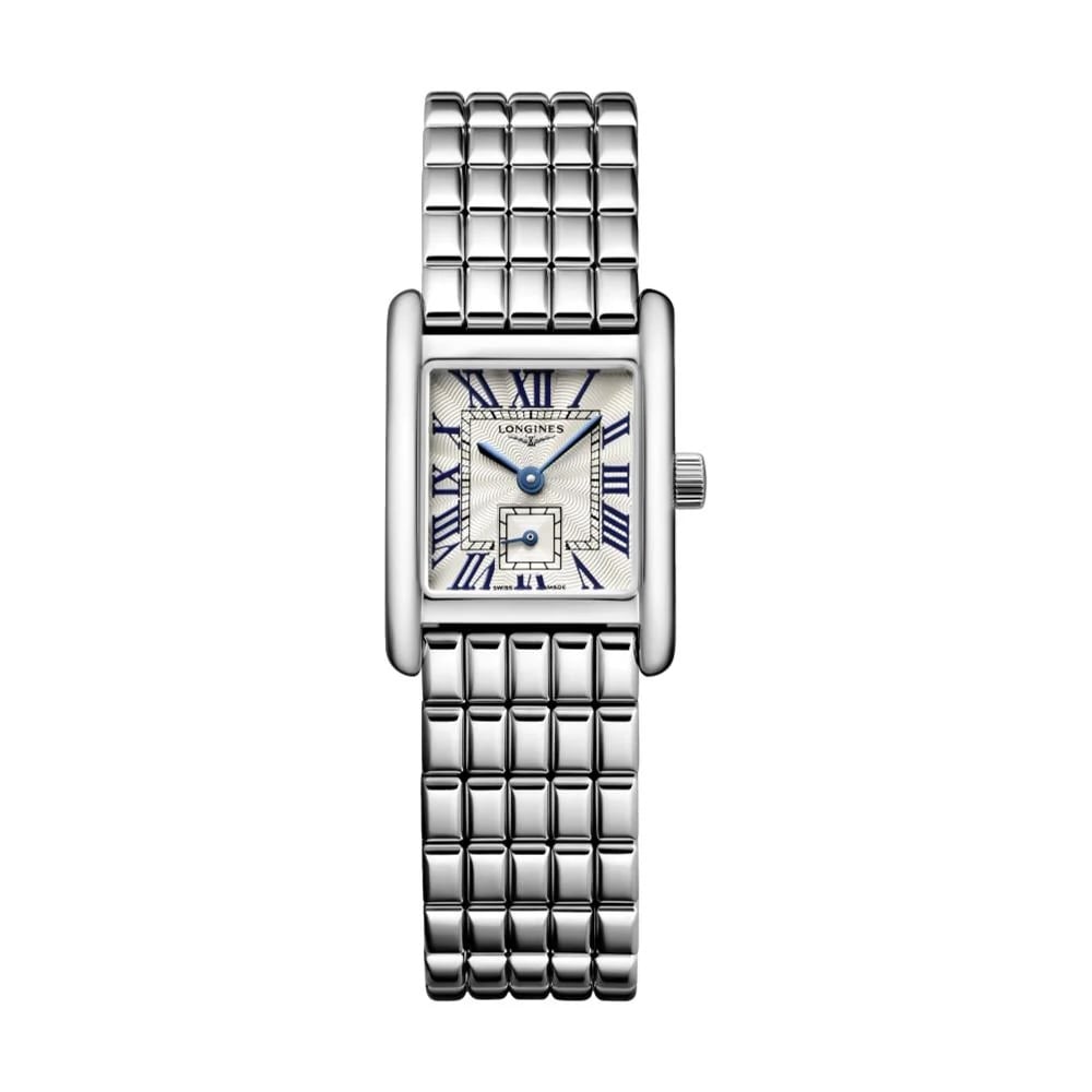 Another pick that strikes me as one of the best-value stainless steel women’s watches on the market today, the Classic Carée from Frederique Constant is among my favorites from the brand’s women’s collection. I think my current favorite is still the Classics Manchette, but that line is, sadly, slightly over our budgetary parameters. Drawing from Art Deco design ethos (one of the most enduringly timeless eras of watch design, in my opinion), the Classic Carée has a rectangular case that’s a petite 21mm in length and a profile of just 5.8mm. The dial is sleek and, well, uber classic (like its name), featuring black-printed Roman numerals marking the hours, a railroad minutes track at the center of the dial, and a gorgeous clous de Paris (or hobnail) textural motif at its center. The three-link bracelet gives this piece a nice visual weight, and the combination of the brushed surfaces at the center links and the polished case adds a more contemporary element into the mix.