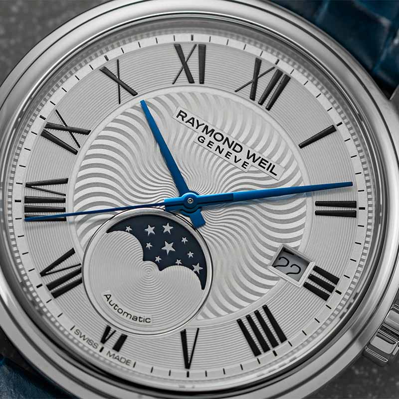 If you’re exchanging vows with a big baseball fan, it’s hard to go wrong with this 3,000-piece limited edition, which pays homage to legendary Pittsburgh Pirates player and renowned humanitarian Roberto Clemente, who won a World Series title with the Pirates in 1960 and perished in a plane crash in 1972 while on a humanitarian aid mission to Central America. The watch’s white dial, with black-and-gold accents, is inspired by Clemente’s Pirates uniform colors, and its 40-mm stainless steel case has a solid engraved caseback with a relief image of the Hall of Famer along with the watch’s limited edition number. The fluted “big crown” securely screws into the case to ensure its water resistance. The watch is equipped with the Sellita-based automatic Caliber 754, which powers the timekeeping as well as a pointer date indication, and is mounted on a brown leather strap with baseball-style double stitching.