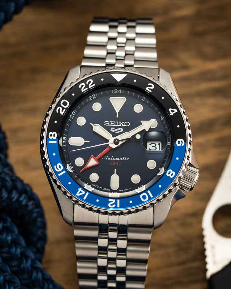That’s right, this GMT adds a blue-and-black bezel color combination to the fray which, in turn, brings a whole different look and feel from the SSK001. Unlike the Rolex, the blue-and-black bezel is contrasted against a sunray-finished blue dial which is then punctuated by that large GMT hand much like the SSK001.