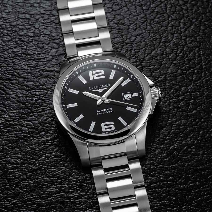 The Conquest collection is one of Longines’ oldest and most enduring, having initially launched in 1954 and which would eventually give rise to the popular HydroConquest subfamily of dive watches. The core Conquest collection is defined by its ultra-legible dials with big, applied Arabic hour numerals at 12 and 6 o’clock, lume-coated rectangular indices at the other hour points, and a small date window at 3 o’clock. Below the 12 o’clock numeral is Longines’ familiar logo with its winged hourglass emblem to represent the flying of time. The 39mm model, the more modest version of the 41mm original, has a black or sunray blue dial and fastens to the wrist with a steel link bracelet whose links bear the same combination of brushed and polished finishes as the case. The movement inside is the ETA-based Longines Caliber L888, with a weekend-proof 72-hour power reserve.