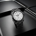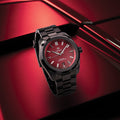 Razor-sharp, CNC-milled horizontal lines with vertical brushing, applied multi-faceted indices, brushed and mirror-polished bevels, and a beveled 6-o’clock date with a tone-on-tone disk for a clean read from off-axis