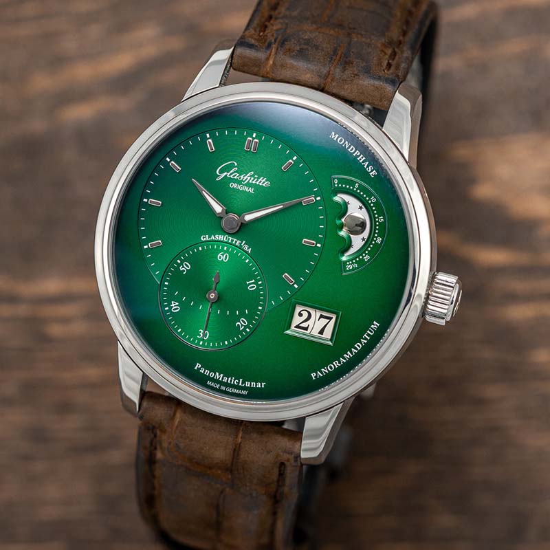 As Exhibit A, take the large, rectangular “Panorama” date display referenced in the model’s name, which occupies the 6 o’clock position — an emblematic element of the Glashütte Original brand that did not exist (or at least wasn’t common) in the 1970s watches that inspired this one, made by the state-owned GUB in the days before German reunification. Exhibit B can be found directly above the big date, below the brand logo at 12 o’clock: a semicircular window with an arrow pointer that offers a view of the rotating disk, numbered 1 to `12, that tallies the chronograph’s elapsed hours. This more understated staging stands in for the more conventional subdial counter that you’d find on most chronographs, whether they’re from the ‘70s or today. Additionally, even the dial’s more traditional counters offer a little something extra: the 9 o’clock subdial makes room for a power-reserve indicator in addition to its primary function of displaying the running seconds.