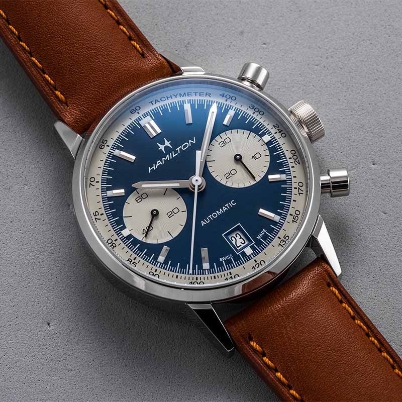 In 1967, TAG Heuer used the Carrera, as the base for its fondly remembered sailor’s watch called the Skipper. The newest version of that model, unveiled in 2023, adopts the vintage-look, bezel-less “glassbox” design of recent Carrera models for its modest, period-appropriate 39mm steel case. The circular-brushed blue dial hosts two sharply contrasting subdials, one at 9 o’clock — in a teal color inspired by the deck of the Intrepid, the yacht once sponsored by Heuer in the America’s Cup — to record 12 elapsed hours; the other at 3 o’clock for the all-important 15-minute countdown to the start of a regatta. The latter subdial is subdivided into three colorful sectors for each five-minute interval — Intrepid Teal, Lagoon Green, and vivid Regatta Orange for the final five minutes. The running seconds and a date window share the 6 o’clock position. The movement inside is TAG Heuer’s automatic TH20-06, a slightly modified version of the chronograph caliber inside the Carrera, and the navy-blue strap is made of water-resistant textile.