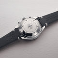 Center hands for hours, minutes and chronograph 1/4 seconds, two subsidiary dials for continuous seconds and 30-minute counter, fine timing device and stop-second