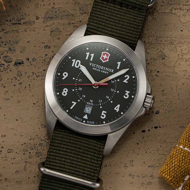 At first glance, the Timex Expedition Scout pretty closely resembles its slightly cheaper little brother, the Weekender covered above. But upon a closer glance, you’ll note the vintage-style syringe hour and minute hands, in place of the Weekender’s long rectangles; and the subtle date window at 3 o’clock displacing the “15” on the inner 24-hour military-time scale, whose Arabic numerals are also slightly thicker. The Expedition Scout has a more contemporary case design, with a sharper, wider bezel and shorter curved lugs attaching to either a nylon NATO or leather strap. The case is brass, with a matte finish, and the dial’s Indiglo surface shines a bright blue-green in the dark.
