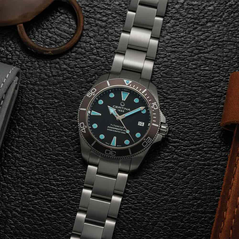 What I really like about this model is that the "fauxtina" on the dial mimics some of the vintage Submariner dials out there, so if you prefer a vintage Sub to its modern counterparts, this one might be up your alley. I think the vintage-inspired lume and tones in general also complement the deep grey hues of the brushed titanium quite handsomely. This watch is up to the standards of ISO 6425 with its 300 meters of water resistance, and carries the brown vintage tones onto the ceramic bezel, which ties the aesthetic together neatly. This watch is powered by the Powermatic 80 6.111 movement, and priced at $1,190, which is quite competitive for a titanium dive watch with an automatic movement, in my humble opinion.