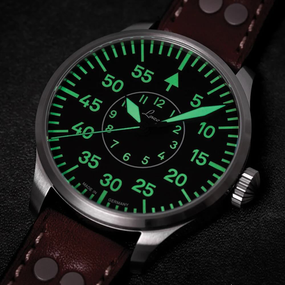 The 41mm case wears a bit smaller than its diameter might suggest, thanks largely to the sharply downturned lugs. When I say downturned, we’re talking about a 45 degree angle — not an insignificant number, but the result is a beefy tool-watch case that’s surprisingly tailored, even for smaller wrists. In fact, it has a trim lug-to-lug of just 46.5mm, pretty tight for the case’s diameter. The finishing is almost exclusively polished, save for brushing on the reverse, and the circular brushed finish on the screw-down exhibition caseback. The semi-guarded crown also screws down, resulting in a dive-worthy 200 meters of water resistance. But since the 104 is technically a pilot’s watch, it’s also low pressure resistant, remaining unaffected by changes in altitude experienced during flight.