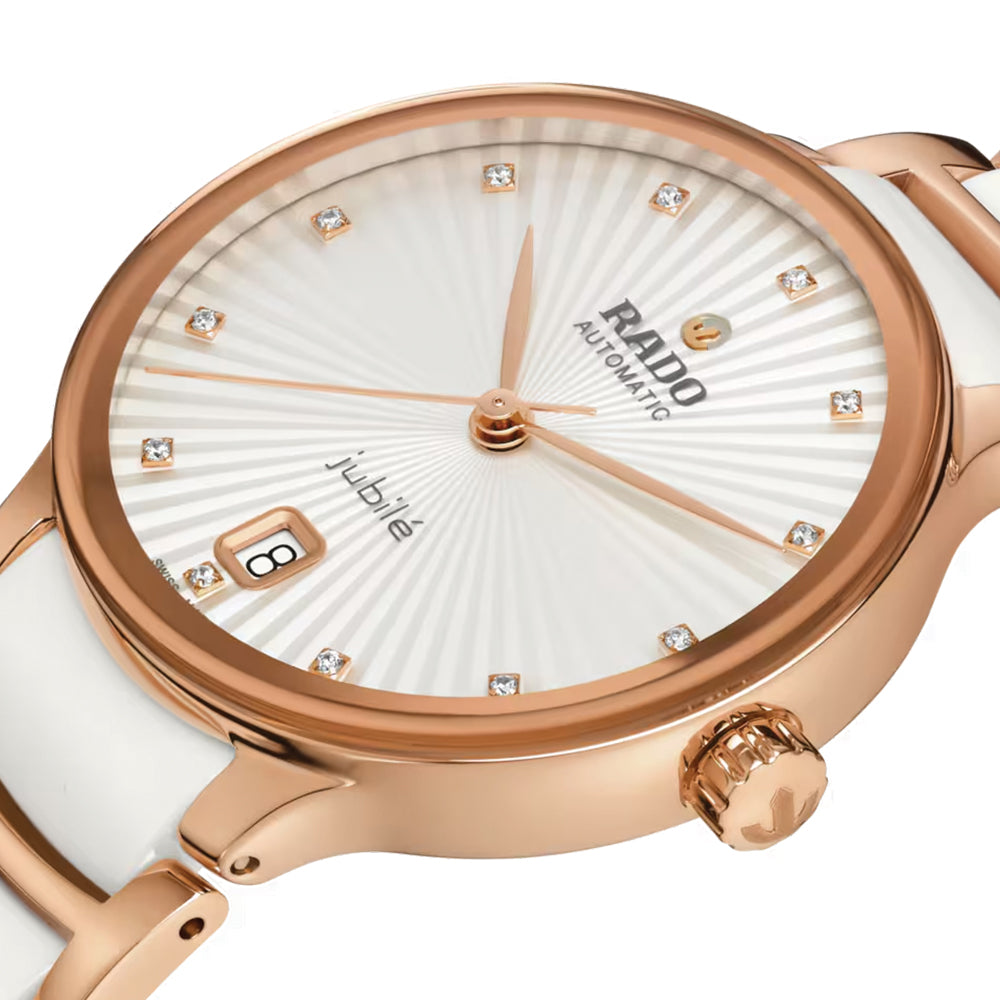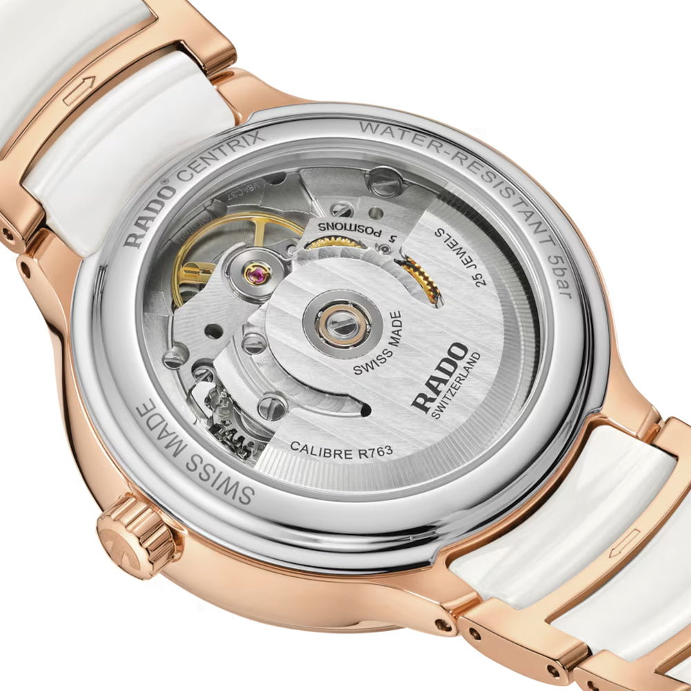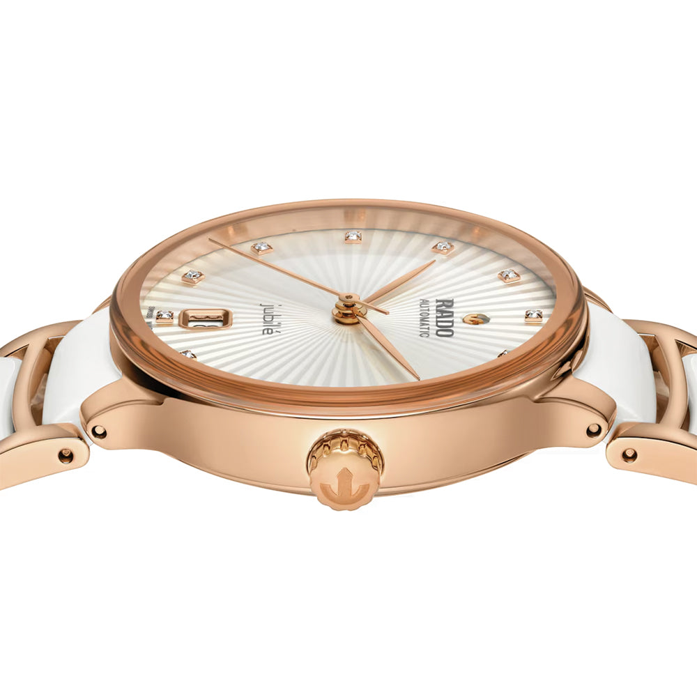 Polished rose-gold-coloured PVD-coated stainless steel with white high-tech ceramic middle links