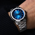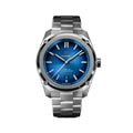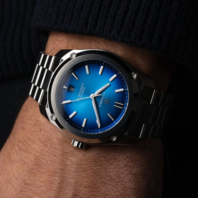 Electric blue dial, hand-applied color gradient with a sunburst finish, color-matched dial ring, matching date disc at 6 o'clock and signature beveled Formex date window.<>Diamond-polished indexes.