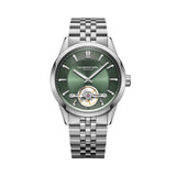 Balance-and-spring assembly, held by a single bridge, echoing the tourbillon regulators. Oscillating weight adorned with a “Côtes de Genève” motif, engraved with the RAYMOND WEIL logo. Movement showcases the mechanism on the dial side, organs positioned above the mainplate and symmetry of the bridge accentuates the architectural nature of a balanced model. Visible balance wheel.