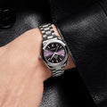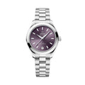 Lavender dial is sun-brushed and coloured with tinted lacquer, 11 applied boat hull-shaped indexes and a date window positioned at 6 o’clock