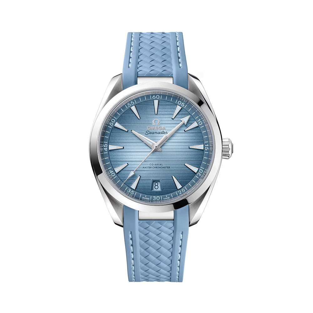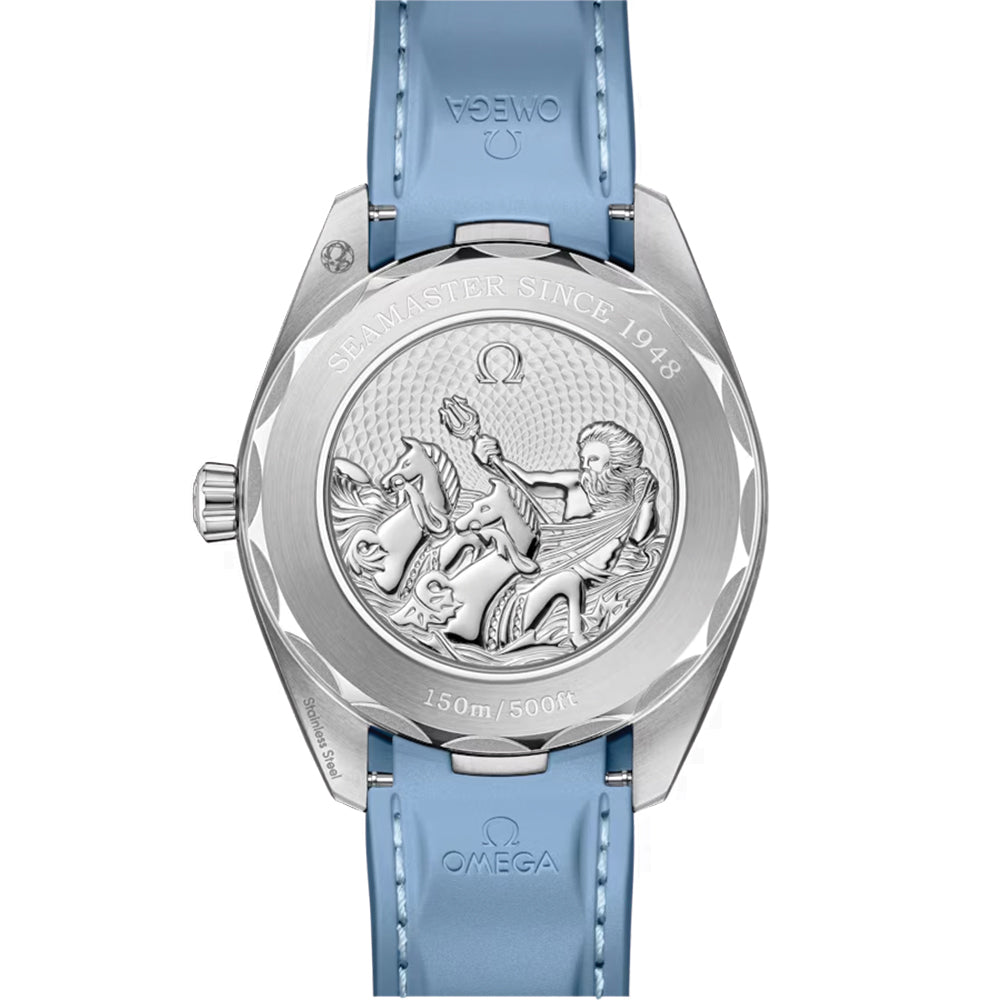The teak pattern dial, in OMEGA’s own Summer Blue, is sun-brushed, PVD-treated, and varnished with a gradient finish to reflect the watch’s level of water resistance. Rhodium-plated indexes, light blue lume on hands and indexes and a matching blue date window indicator at 6 o’clock.