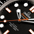 Black aluminium dial, rhodium plated skeletonized indexes, orange four quarter indexes and Seamaster name, OMEGA logo transferred in white