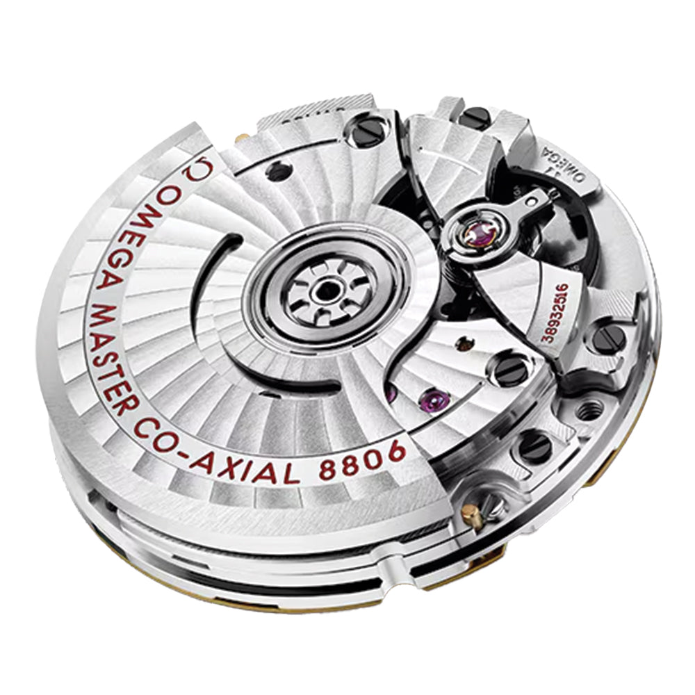 Self-winding movement with a Co-Axial escapement, certified Master Chronometer, approved by METAS, anti-magnetic fields reaching 15,000 gauss, free sprung-balance with silicon balance spring, automatic winding in both directions, helium escape valve, and special luxury finish with rhodium-plated rotor and bridges with Geneva waves in arabesque.