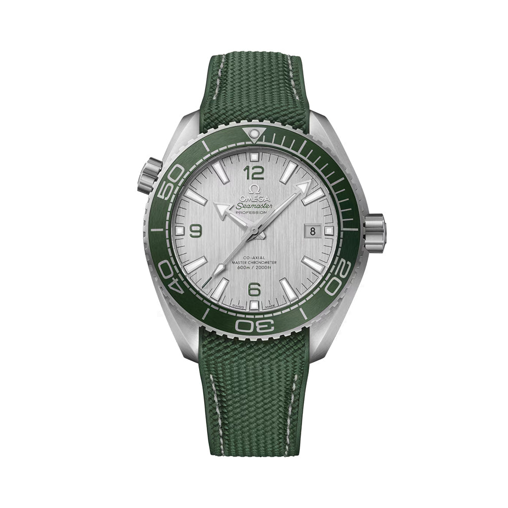 Brushed stainless steel dial, date window at 3 o’clock, green varnished Arabic numerals, and transferred words in green and black. OMEGA logo and hour markers in brushed PVD stainless steel with white Super-LumiNova