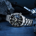 Textured black dial providing a high contrast with the indices for superior visibility, date window inbetween 4 and 5 o'clock