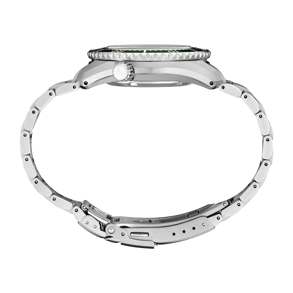 Rich green dial with date window inbetween 4 and 5 o'clock
