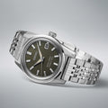 Retro aged green dial with vertical hairline finish and metallic texture and date window at 3 o'clock
