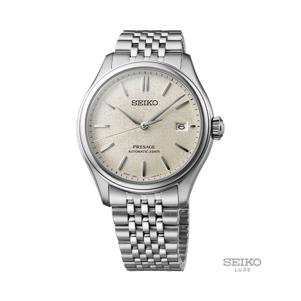 “Shiro-iro,” the color of unbleached natural silk, the pressed patterned dial evoked the texture of silk fabric.