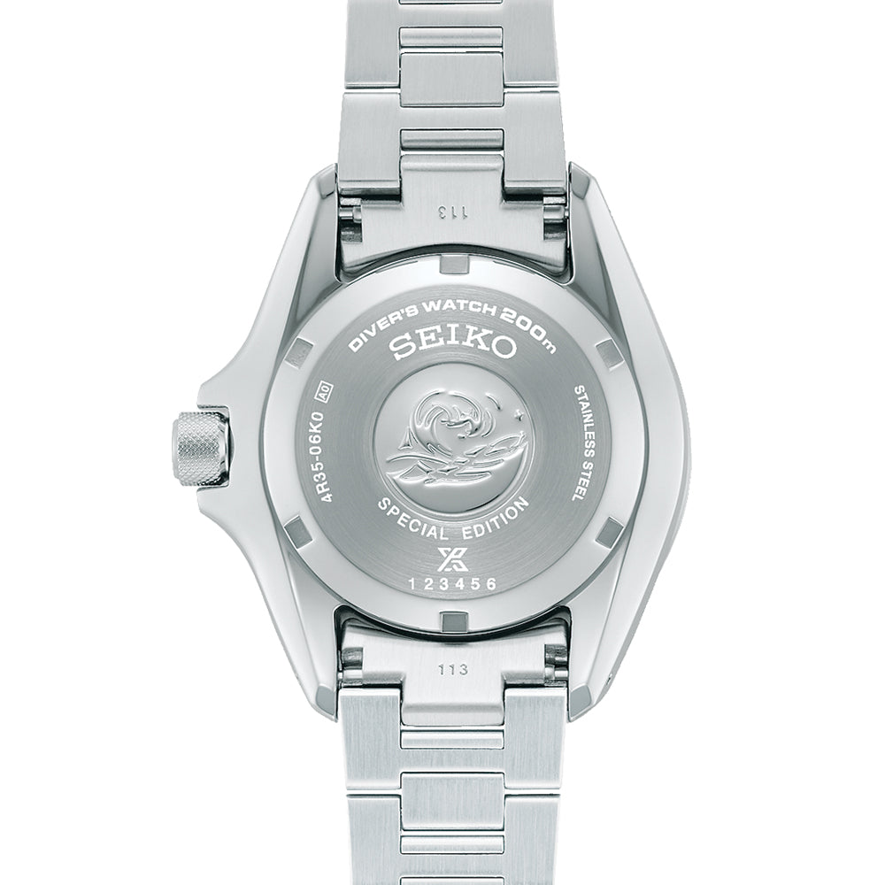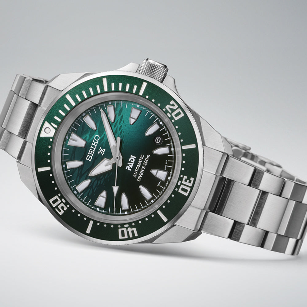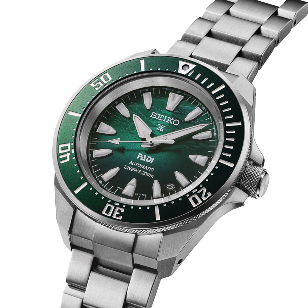 Emerald-green gradation dial inspired by the shimmering light and rippling surface as seen from underwater, date window and PADI logo