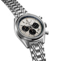The silver dial, framed by a tachymeter scale, features blue-gray subdials a date calendar